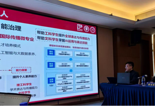 天津大学新媒体与传播学院特聘研究员、系主任邵明来在主题演讲《数智赋能交叉融合的新闻与传播人才培养》中提出,面对科技革命与大国博弈相互交织的重大挑战,新闻与传播人才培养要服务国家重要战略需求,向综合交叉发力。天津大学新媒体与传播学院以“新媒体”为核心定位,是既实践新文科建设也实践新工科建设的新闻传播学院,坚持立德树人、着力培养熟悉新闻传播规律、善用数据算法、懂得新媒体治理的引领性复合型人才。围绕 数字新闻学、网络国际传播、智能传播与算法治理等方向开展人才培养、科学研究与社会服务,立足人工智能时代,做好教学布局与改革,帮助工科学生提升全球表达与传播能力,帮助文科学生掌握AI运用与表达技能。